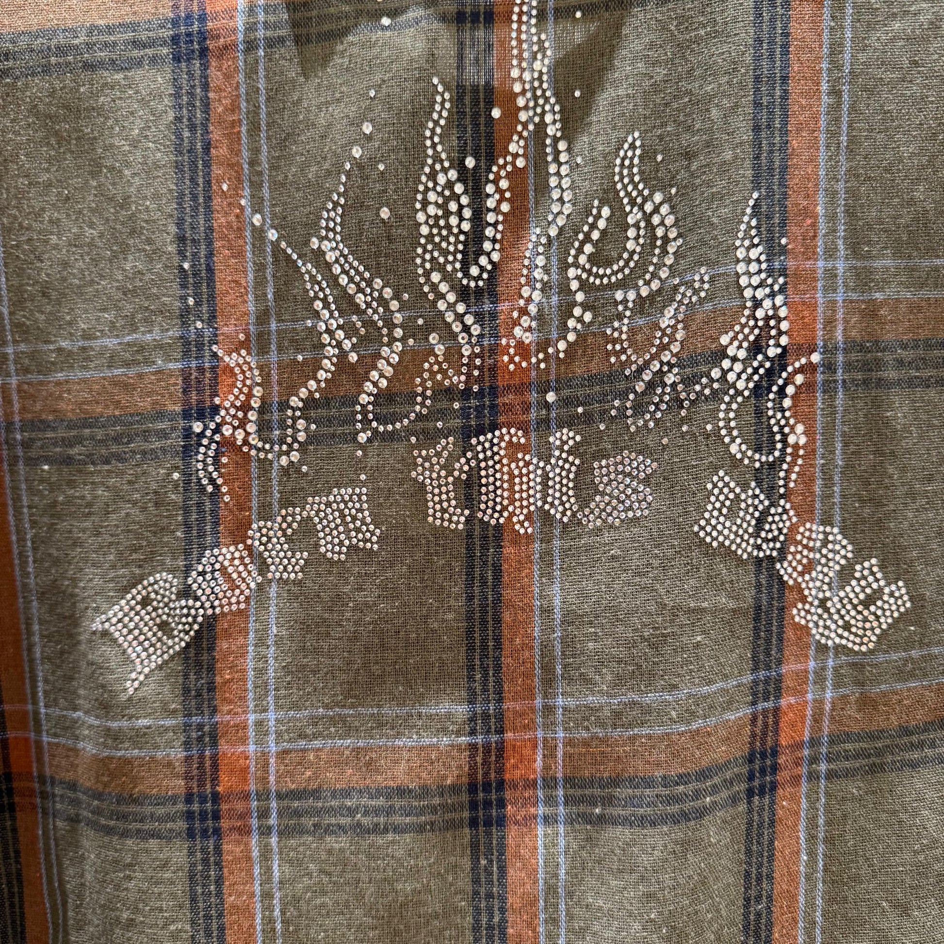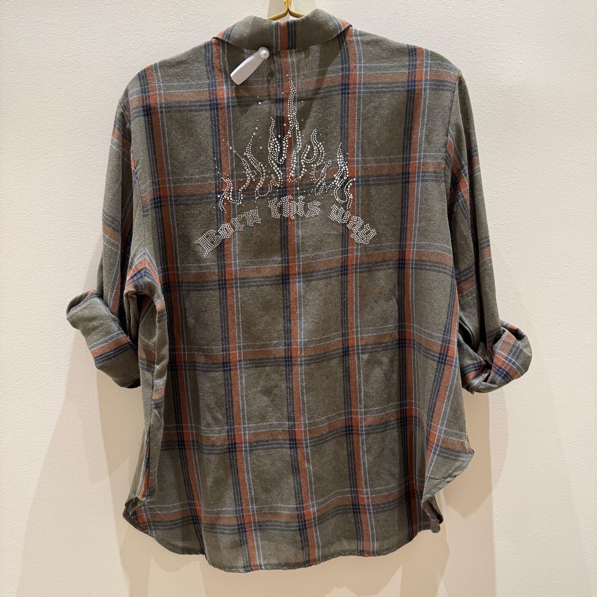 Camisa verde de cuadros con botones plateados y brillantes en la espalda.