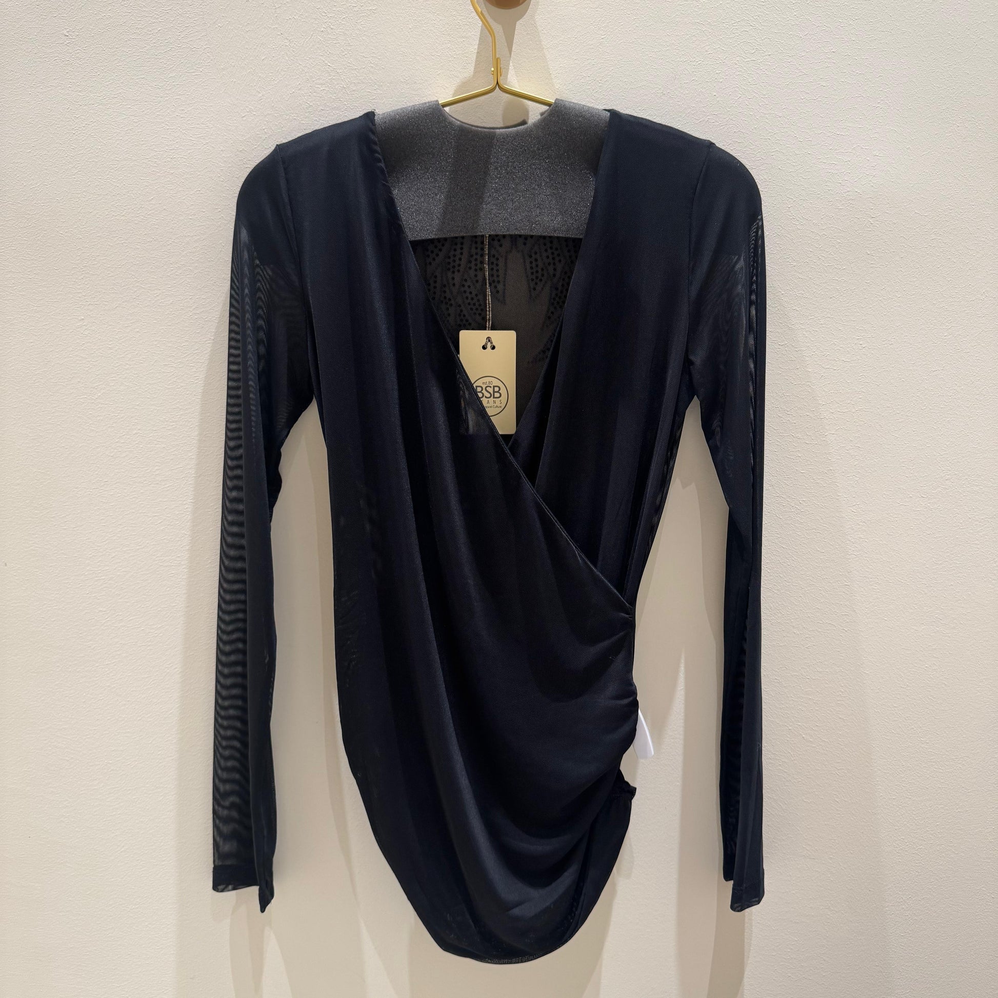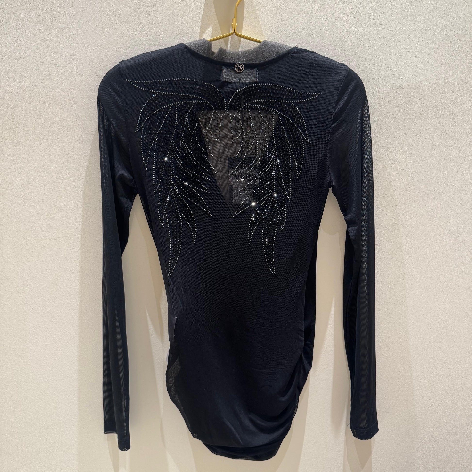 Camiseta negra transparente de manga larga. Tiene un escote en forma de V cruzado por delante. En la espalda hay dos alas dibujadas con brillantes.