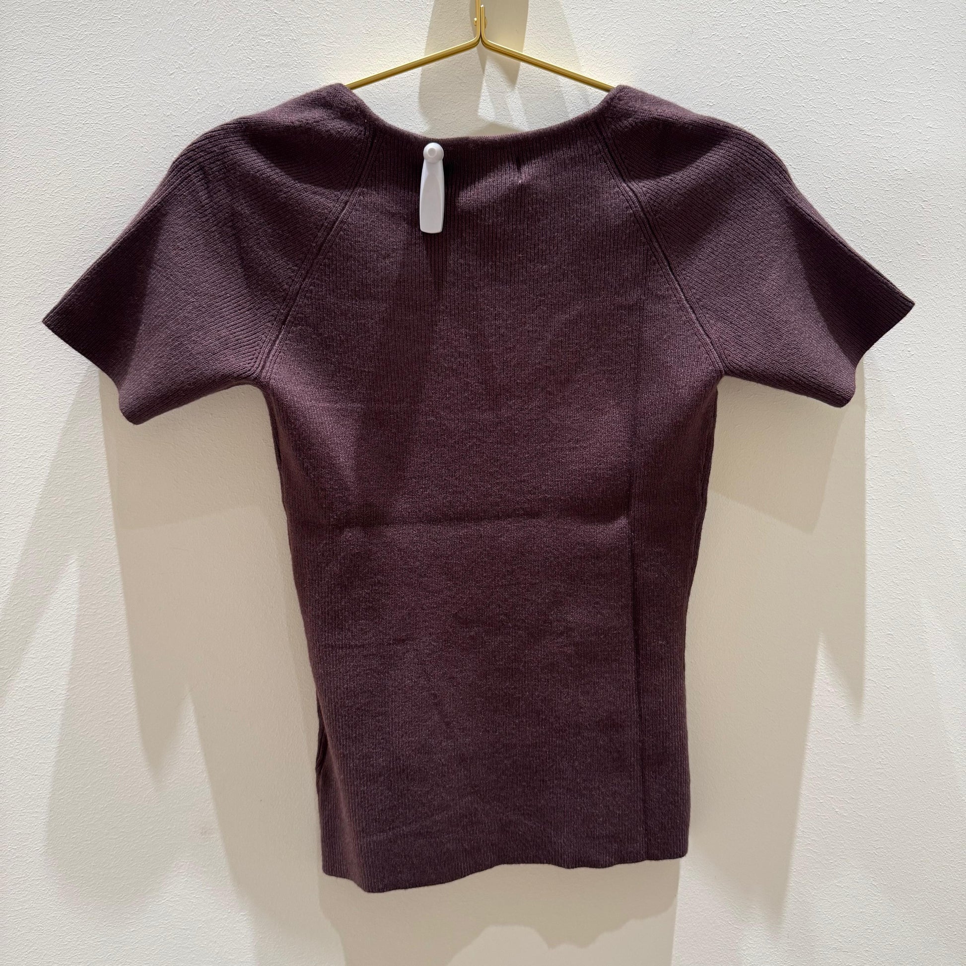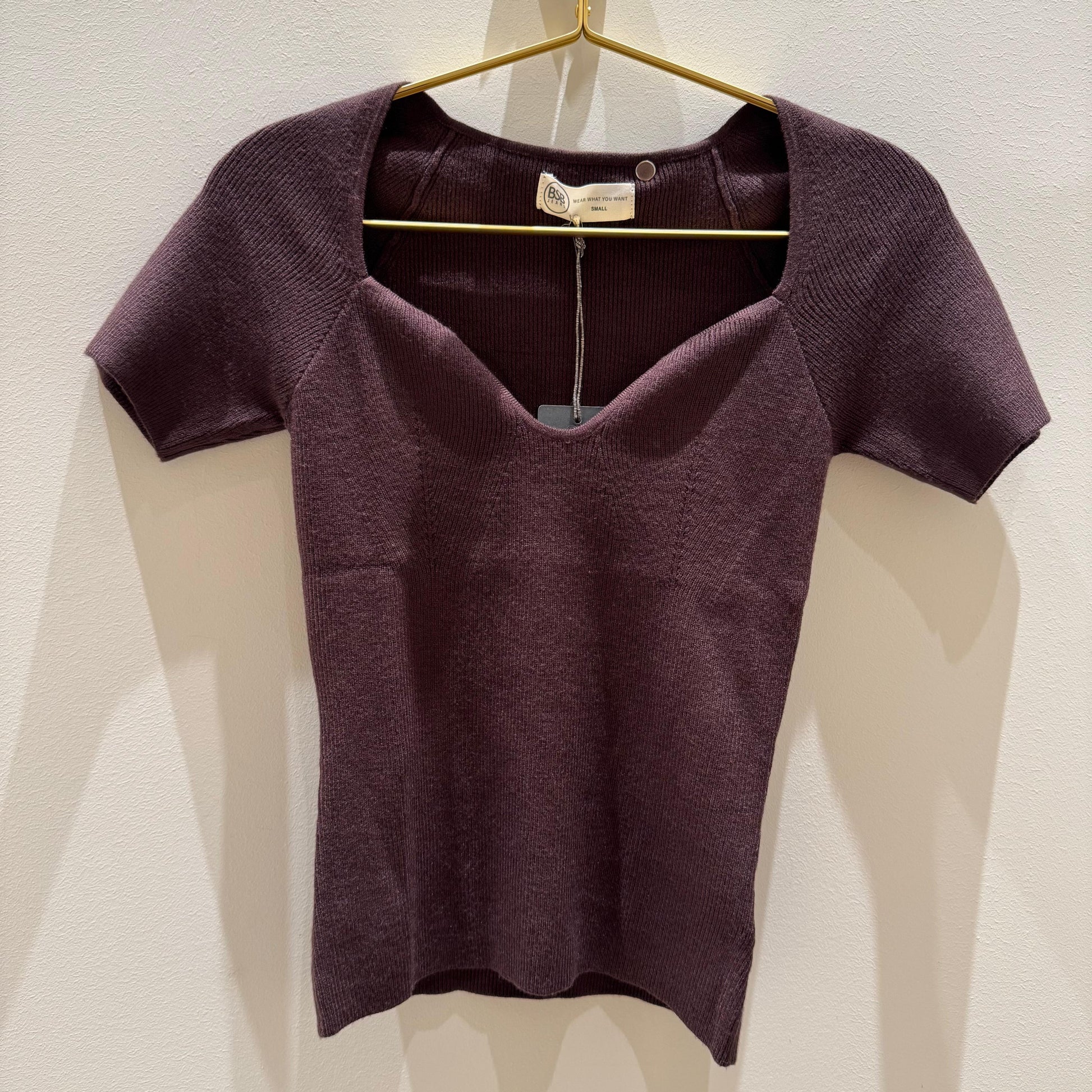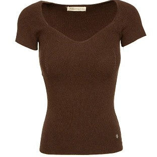 Top largo de color marrón con un escote en forma de corazón y una manga corta clásica.